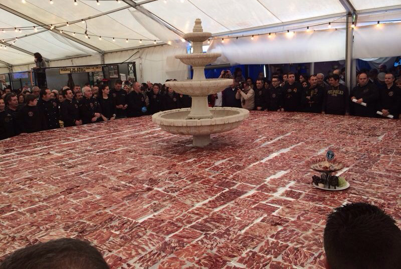 En un principio, el récord elegido para intentar batirlo era el de componer el mayor plato de jamón del mundo, aunque finalmente la organización de los Guinness no admitió su homologación. Ello no impidió que se siguiera adelante con la idea, consiguiendo un plato de 47,5 metros cuadrados, cortado por 30 de los cortadores presentes, y que quedará registrado como récord mundial.