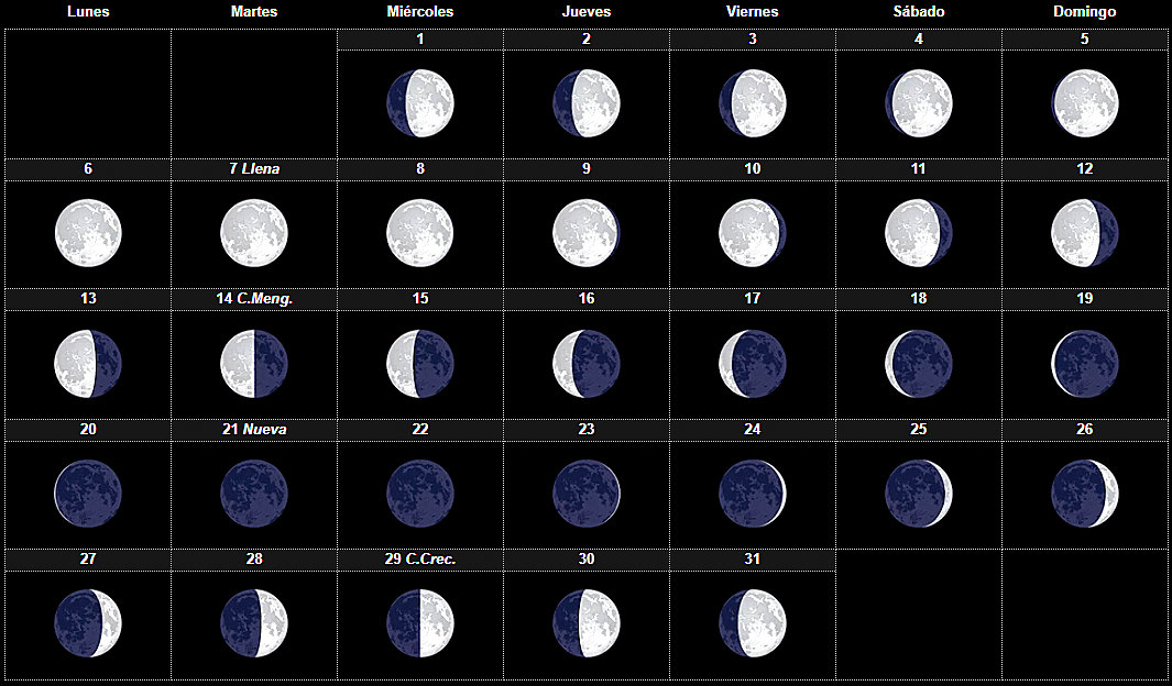 Día 29 miércoles.- Luna en cuarto creciente a las 17:21 en Capricornio; distancia geocéntrica 392.736 km.