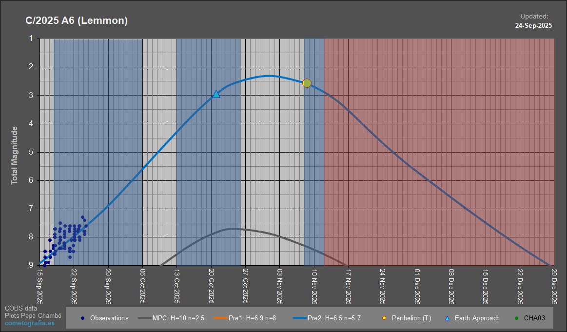 Este mes podemos tener la suerte de ver, a simple vista, pudiendo alcanzar una magnitud 2, el cometa C/2025 A6 Lemmon, durante los primeros días del mes, ya que a partir del 12 ya no será observable. Pepe Chambó, en su página www.cometografia.es ha preparado una curva de luz en la que podréis ver los momentos óptimos de observación. Su tránsito será del 1 de octubre en Lince, día 2 Leo menor, día 6 Osa Mayor, día 14 Canes Venatici (perros de caza) y ya lo perdemos. Por cierto, tendremos que esperar unos 1.338 años para volver a verlo. (Ver trayectoria al final de la colaboración).