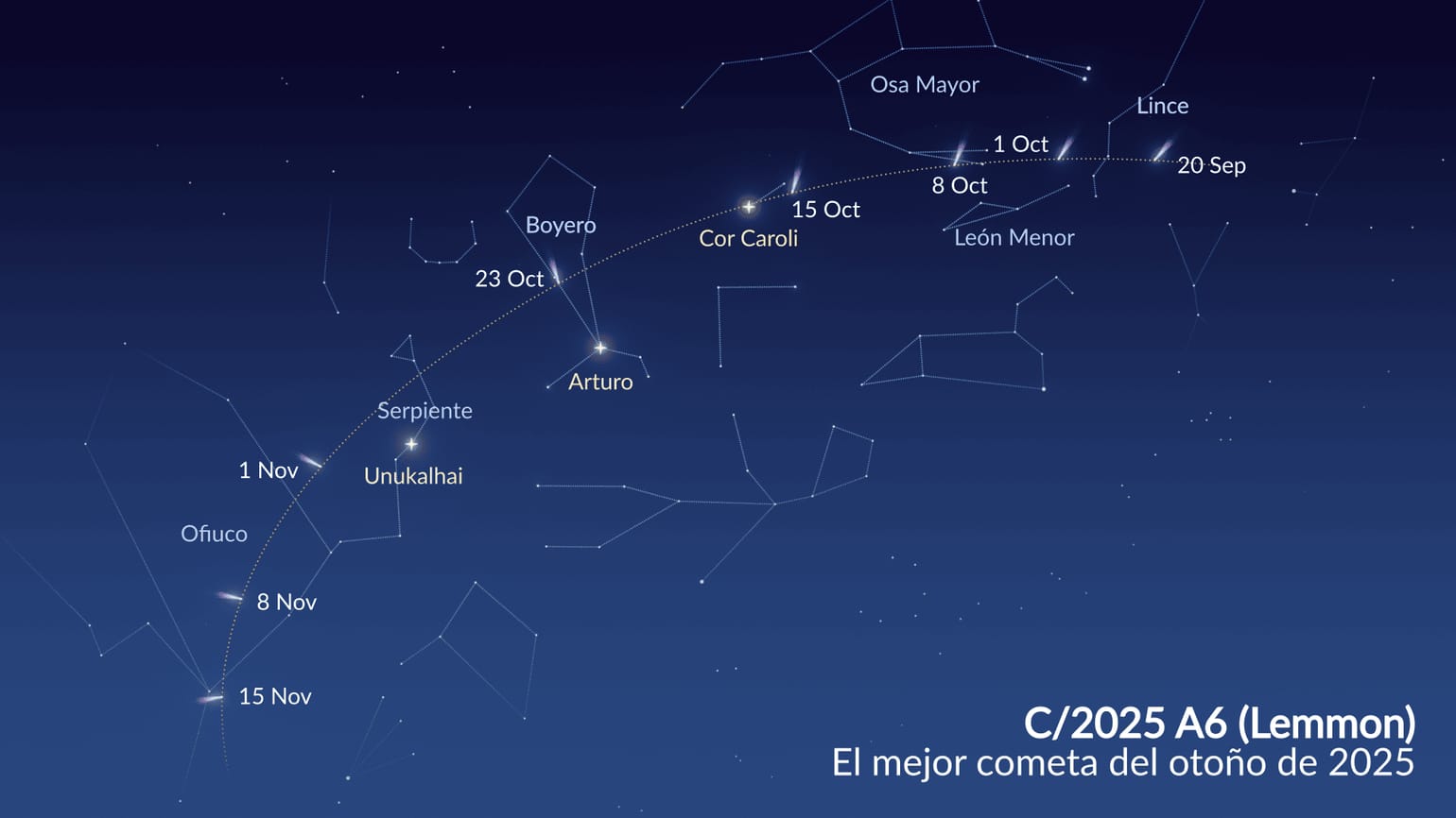 Dos cometas serán visibles en octubre, un espectáculo astronómico pocas veces repetible. El Cometa C/2025 A6 (Lemmon) podrá ser observable a simple vista en los primeros días del mes, para ver el C/2025 R2 SWAN si necesitaremos, al menos, unos prismáticos.