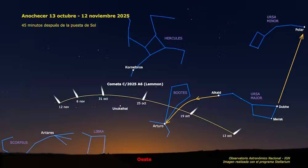 Este mes seguiremos disfrutando del cometa C/2025 A6 Lemmon, que se mantendrá con un brillo (magnitud) de 04.0 lo que lo hace visible a simple vista en cielos muy oscuros (ver trayectoria al final de la colaboración).