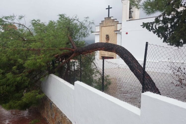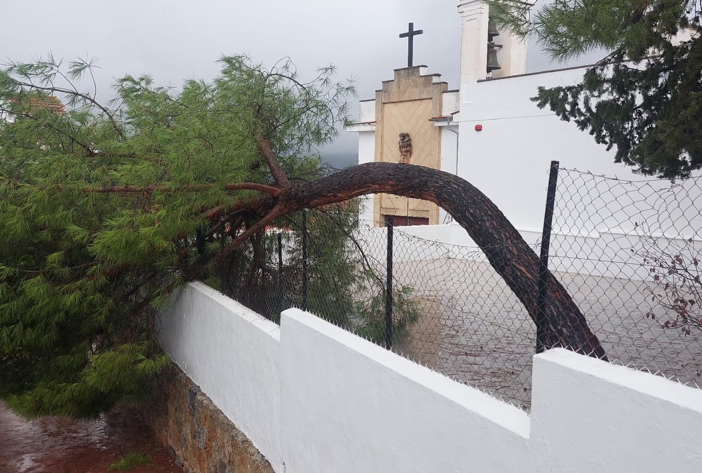 El aguacero, acompañado de fuertes rachas de viento, ha provocado el desprendimiento de cuatro árboles, dos de ellos en el patio de la Escuela Oficial de Idiomas, en la barriada de la Dehesa, así como la caída de dos farolas. Una de ellas ha dañado a un vehículo que se encontraba estacionado. De igual forma se ha levantado parte de la cubierta de la oficina del Servicio Andaluz de Empleo (SAE) del polígono industrial El Fuerte, así como el corrimiento de tierras en varios caminos rurales.