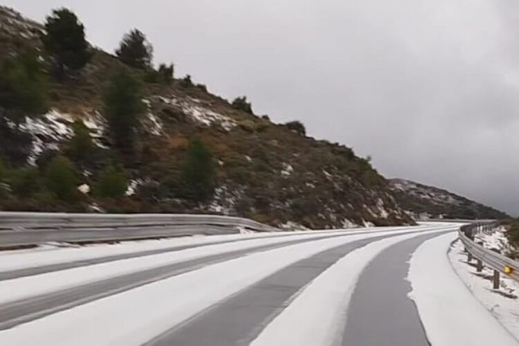 El granizo ha alcanzado los cuatro centímetros de grosor sobre la carretera.