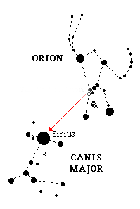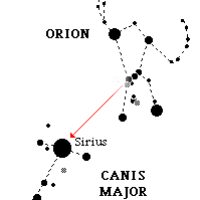 Si nos situamos en el cinturón de Orión, popularmente las “Tres Marías”, y trazamos una línea con un imaginario “lápiz celeste” hacia la izquierda, nos encontramos con Sirio o Sirius (denominación latina), una de las estrellas más brillantes de la bóveda celeste que tiene una magnitud de -1,46 y está a solo 8,7 años luz de nosotros. Sirio es muy fácil localizarla en los cielos invernales y pertenece a la constelación del Can Mayor, uno de los perros que acompañaban al gigante Orión según la mitología griega, y está representado en el cielo como un perro apoyado sobre sus patas traseras, siendo la estrella Sirio su hocico.
