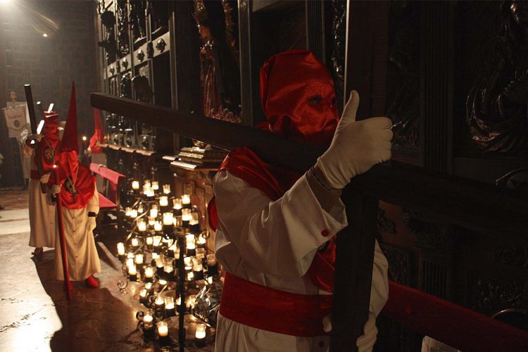 Imagen de un nazareno de la Hermandad del Cristo de la Sangre en la noche dle Miércoles Santo,