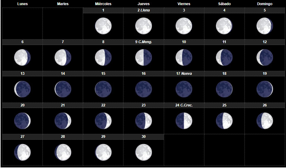 Día 8 miércoles.- Mínima declinación de la Luna (-28°15’56”).