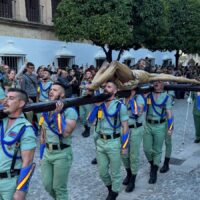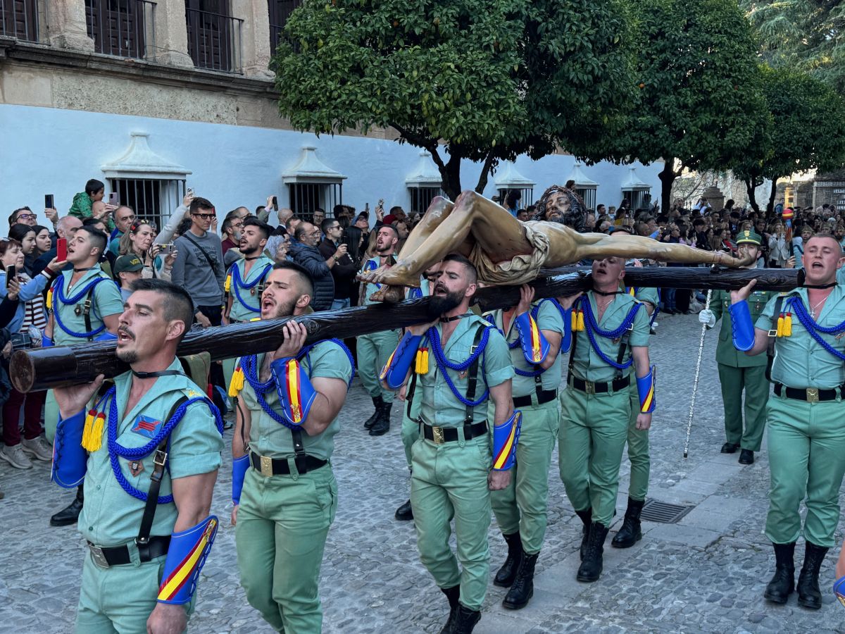 Una multitud aguardaba el paso de la unidad legionaria, que con Banda de Guerra acompañaba al Cristo de la Buena Muerte, que como manda la tradición era portado a brazos de jóvenes militares.